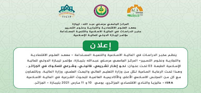 ينظم المركز الجامعي مسرلي عبد الله تيبازة ، مؤتمر تيبازة الدولي للمالية الاسلامية يومي 10-11 مارس 2021