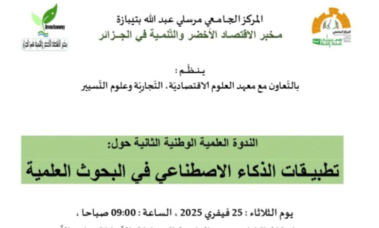 ينظم مـــــخبر الاقتصــــــاد الأخضر والتّنـــمـــية في الــــجــزائر بالتّعاون مع معهد العلوم الاقتصاديّة، التّجاريّة وعلوم التّسيير النــــــــــدوة الوطنية الثانية حول :” تطبيــــــقات الذكاء الاصطناعي في البحوث العلمية “يوم الثلاثاء : 25 فيفري 2025 ، الساعة : 09:00 صباحا ، بقاعة المناقشات ،معهد العلوم الاقتصاديّة، التّجاريّة وعلوم التّسيير.