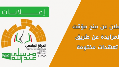 تعلن نيابة مديرية الدراسات في التدرج والتكوين المتواصل والشهادات للمركز الجامعي بتيبازة،أنه تم فتح باب الترشح للسنة الأولى ماستر برسم…